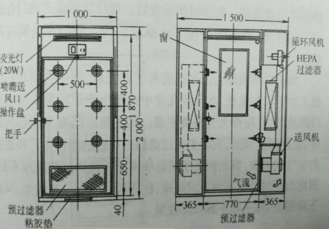 此外,國外有觀點認(rèn)為,風(fēng)淋室作為潔凈區(qū)與準(zhǔn)潔凈區(qū)的一個分界,它具有某種警示性的心理作用,有利于規(guī)范入室人員在無塵車間內(nèi)的活動。風(fēng)淋室由潔凈設(shè)備廠定型生產(chǎn)。常見的有單人、雙人式。對于人員較多的無塵車間還可以設(shè)計為通廊式,圖6.24給出了單人吹淋室的示意圖。