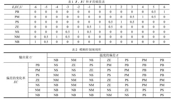 溫度偏差 e 的實(shí)際論域?yàn)閇-12℃,12℃(]超出范圍的越限值取上限或者下限值)。溫度偏差變化率 ec 的實(shí)際論域取[-3℃/min, 3 ℃/min(]越限值處理同上)。實(shí)際偏差和偏差變化率值分別通過各自的比例因子轉(zhuǎn)換到模糊控制器的基本論域內(nèi)。這里 E 和EC 的論域都取[-6,-5,…,0,…, 5 , 6 ] 的離散區(qū)間。