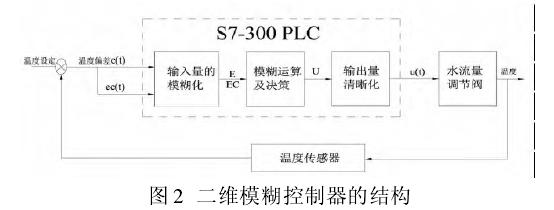 本系統(tǒng)側(cè)重于調(diào)溫除濕機(jī)的“調(diào)溫”,因?yàn)橹灰凉駲C(jī)開,功率一定,“除濕”總是以單位時(shí)間多少除濕量發(fā)生的。改善調(diào)溫除濕機(jī)的性能重點(diǎn)在于對(duì)溫度的把握上,以溫度為主要控制對(duì)象,通過溫度控制來影響濕度。本設(shè)計(jì)采用二維模糊控制器,如圖 2 所示。其中輸入變量為溫度偏差 e和偏差變化率 ec,輸出變量為控制溫度的變量,冷凍水流量閥的開度 u。濕度的模糊邏輯用同樣的方法設(shè)計(jì),下面僅討論溫度。