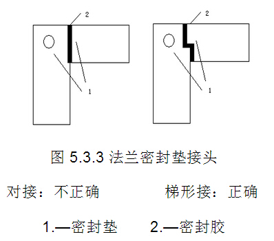 5.2.21當用于5級和高于5級潔凈度級別場合時,角鋼法蘭上的螺栓孔和管件上的鉚釘孔孔距均不應(yīng)大于65mm,5級以下時不應(yīng)大于100mm。薄壁法蘭彈簧夾間距不應(yīng)大于100mm,頂絲卡間距不應(yīng)大于100mm。矩形法蘭四角應(yīng)設(shè)螺栓孔,法蘭拼角縫應(yīng)避開螺栓孔。螺栓、螺母、墊片和鉚釘應(yīng)鍍鋅。如必須使用抽芯鉚釘,不得使用端頭未封閉的產(chǎn)品,并應(yīng)在端頭膠封。