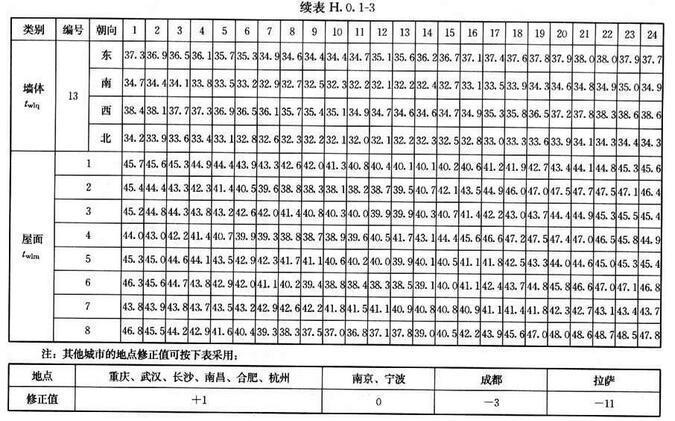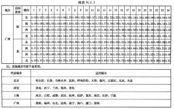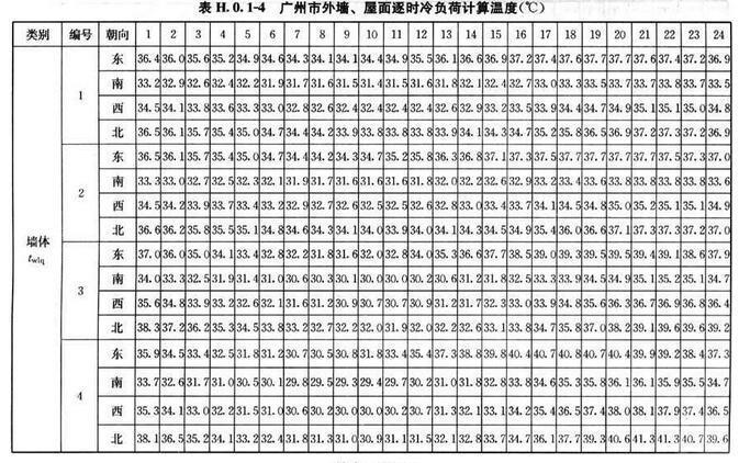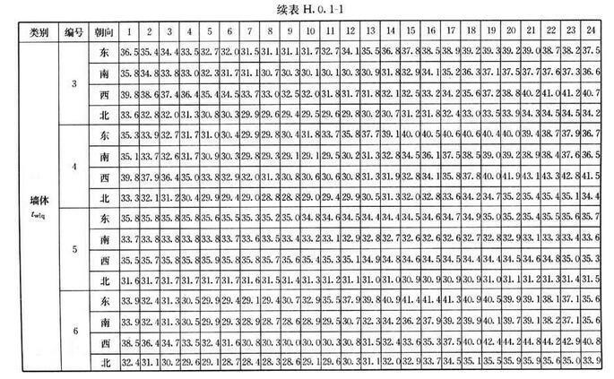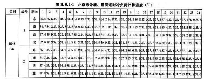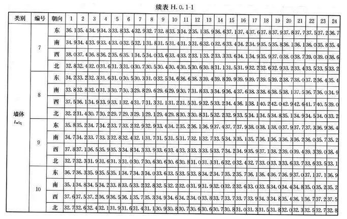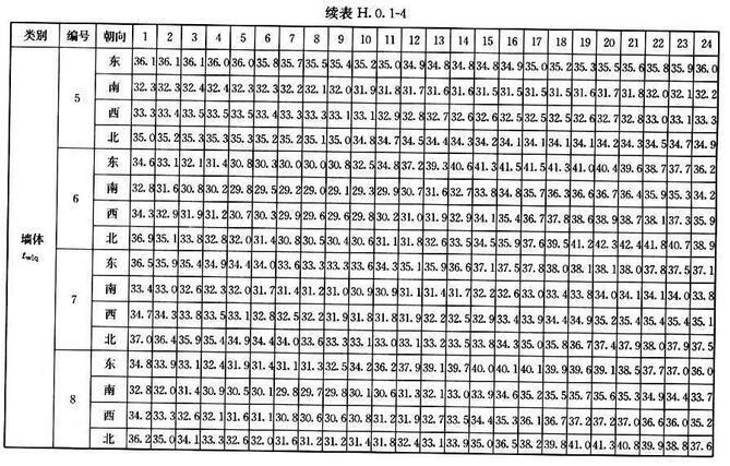H.0.1 北京、西安、上海及廣州等代表城市外墻、屋面逐時冷負(fù)荷計算溫度twlq、twlm,可按表H.0.1-1~表H.0.1-4采用。外墻、屋面類型及熱工性能指標(biāo)可按表H.0.1-5、表H.0.1-6采用。