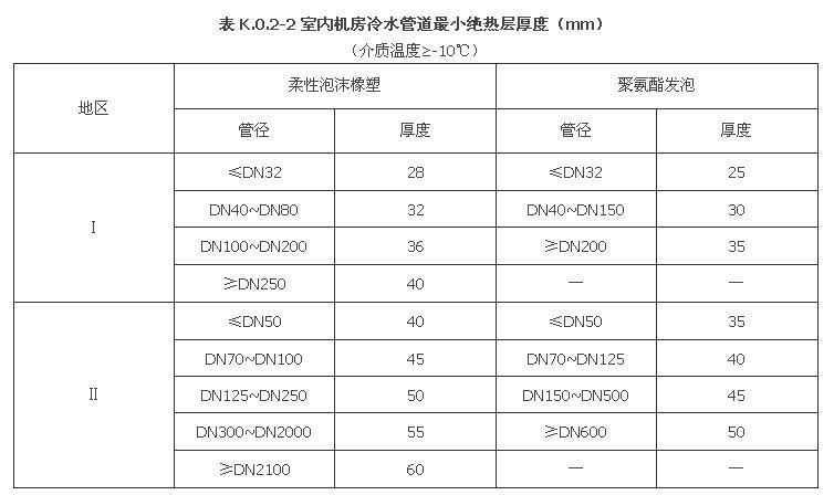 K.0.2 室內(nèi)機房內(nèi)空調(diào)設(shè)備與管道保冷厚度可按表K.0.2-1~表K.0.2-2中給出的厚度選用。