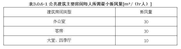 1 公共建筑主要房間每人所需最小新風(fēng)量應(yīng)符合表3.0.6-1規(guī)定。