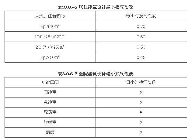 2 設(shè)置新風(fēng)系統(tǒng)的居住建筑和醫(yī)院建筑,所需最小新風(fēng)量宜按換氣次數(shù)法確定。居住建筑換氣次數(shù)宜符合表3.0.6-2規(guī)定,醫(yī)院建筑換氣次數(shù)宜符合表3.0.6-3規(guī)定。