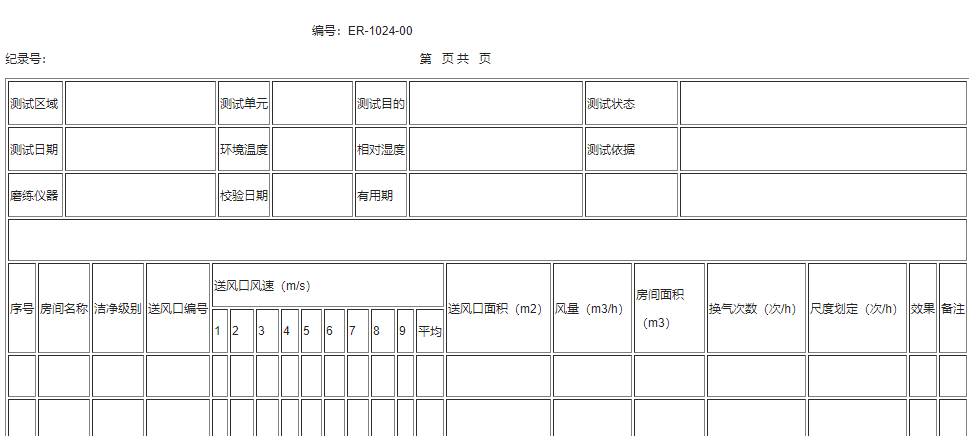 附注:潔凈室風力排風量及換風次數(shù)檢測記錄