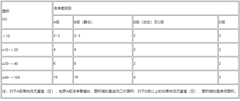 注:針對(duì)A級(jí)單邊流無(wú)菌室(區(qū)),包含A級(jí)清潔事兒臺(tái),總面積指的是正壓送風(fēng)口外總面積;針對(duì)D級(jí)以上的非單方面流無(wú)菌室(區(qū)),總面積指的是屋子總面積。