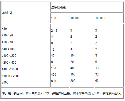 注:表格中的總面積,針對(duì)單邊流無(wú)塵室,就是指排風(fēng)總面積,針對(duì)非單方面流無(wú)塵室,就是指屋子總面積。