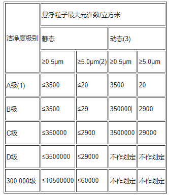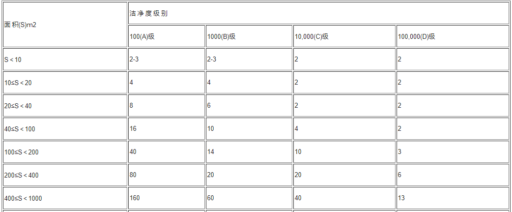 (1)為了更好地確定A級潔凈區(qū)的等級,每一個(gè)取樣點(diǎn)的采樣量不能低于1m3。A級區(qū)氣體飄浮顆粒,以≥5.0μm的漂浮顆粒為程度限度。B級潔凈區(qū)(靜態(tài)數(shù)據(jù))的氣體飄浮顆粒,與此同時(shí)包含表格中二種粒度的細(xì)顆粒物。