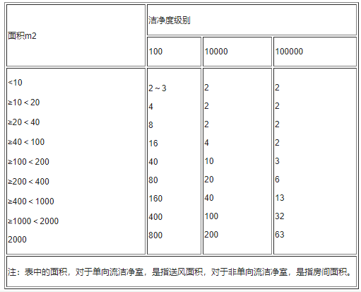 注:表格中的總面積,針對單邊流潔凈室,就是指排風總面積,針對非單方面流潔凈室,就是指屋子總面積。